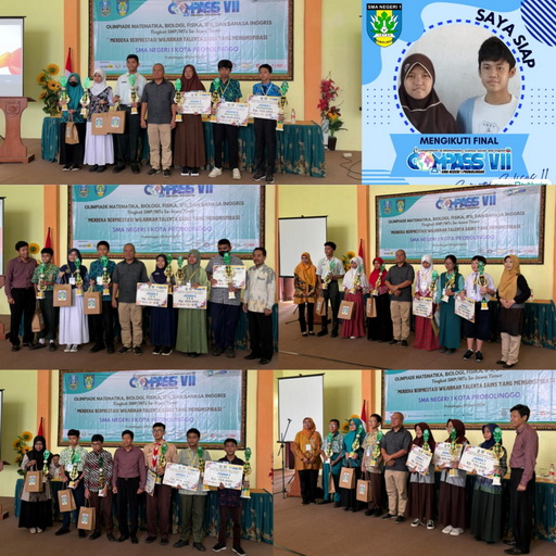 Setelah melalui babak penyisihan secara online pada tanggal 20 April 2024, maka terpilihlah finalis dari ke 5 bidang Olimpiade yang di lombakan (Matematika, Biologi, Fisika, IPS dan Bahasa Inggris). Para Finalis COMPASS VII ini tampak semangat mengikuti test tulis di SMAN 1 kota Probolinggo. Dari beberapa Finalis yang telah di tentukan masing-masing bidang, akhirnya tersaring 6 pemenang dari dari kelima bidang tersebut, berikut ini nama-nama pemenangnya: